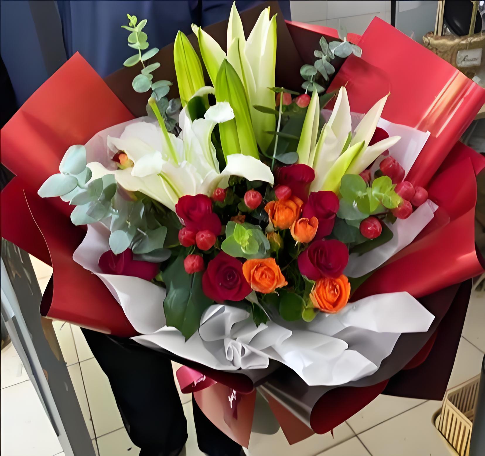 漳州华安县花店包11枝红玫瑰、2枝多头白百合、6枝橙色多头玫瑰、红豆、尤加利叶
